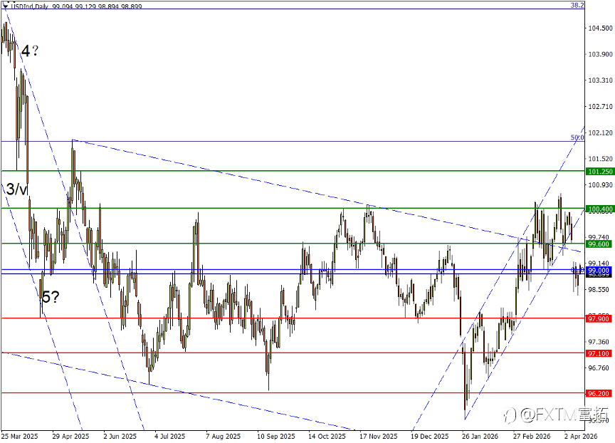 在2026年初之前,市场对美元的中期判断其实已相对清晰。 随着美国经济增速放缓、财政与贸易不确定性上升,加上联储局进入降息周期后段,美元指数原本已被广泛视为步入结构性转弱阶段,今年1月中一度下探至95水平附近,反映市场共识。 然而,2月28日美国、以色列与伊朗战争爆发后,这一趋势被短暂打断。 战事急速升级,霍尔木兹海峡面临封锁风险,全球能源供应链受冲击,市场避险情绪瞬间升温,美元重新发挥「最后流动性避风港」角色。 短短三周内,美元指数自97附近急升并突破100心理关口,3月底一度见顶,走势与历史上多次地缘冲突期间的美元表现高度吻合。 不过,值得留意的是,即使在战争高峰期,美元升幅其实亦未能与油