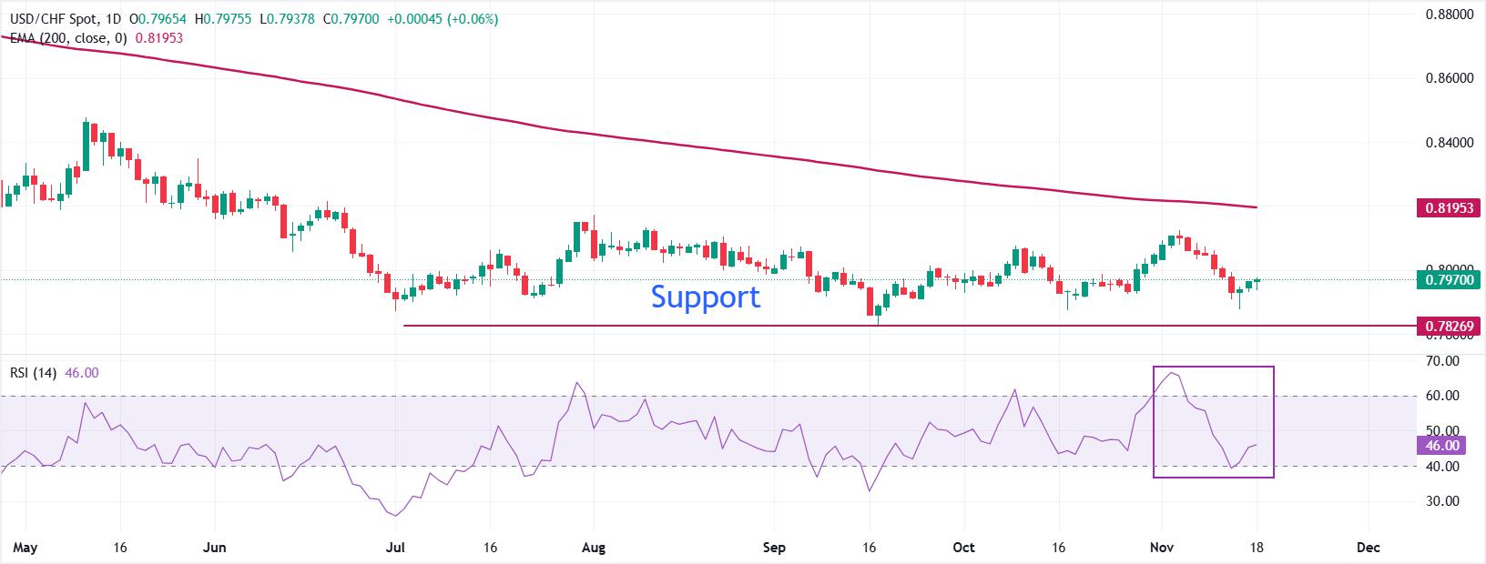 USD/CHF naik mendekati 0,7972 seiring Dolar AS melanjutkan kenaikannya.Harapan dovish Fed yang menyusut untuk pertemuan Desember telah mendorong Dolar AS.Harga Produsen dan Impor Swiss turun sebesar 0,3% bulan ke bulan pada bulan Oktober. Pasangan USD/CHF melanjutkan kenaikan beruntunnya selama tiga