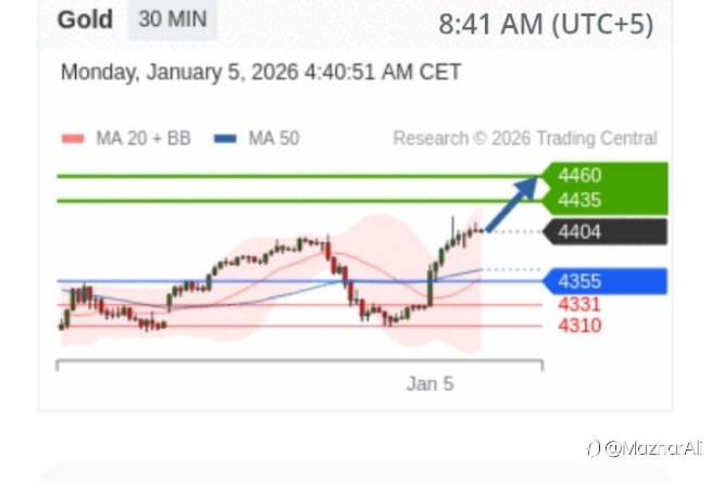 Date: January 5, 2026 | Time: 08:41 AM (UTC 5) Current Price Action & Key Observations Gold is currently trading near 4,404, positioned between the 20-period MA Bollinger Band and the 50-period MA, indicating a consolidation phase with a bullish bias. The price is holding above the critical pivo