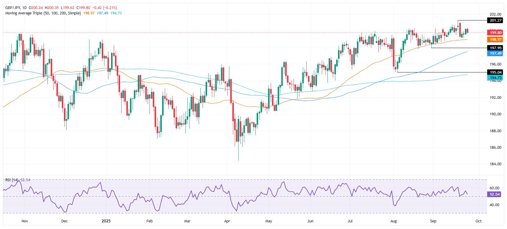 GBP/JPY retreats 0.27% to 199.72 after rejection near 200.34 weekly high.UK debt auction shows weaker demand, stoking fiscal worries ahead of Reeves’ November 26 autumn budget.BoJ minutes flagged scope for hikes if outlook holds; markets price 72% chance of 25-bps move this year. The Pound Sterling