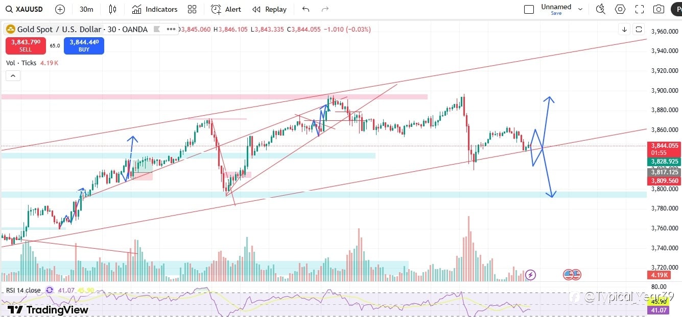 Analysis 📊 Timeframe: 30M | Current Price: 3844 Support Levels: 3830 / 3815 Resistance Levels: 3851 / 3875 🔍 Conclusion: Gold is currently at a crucial decisi...