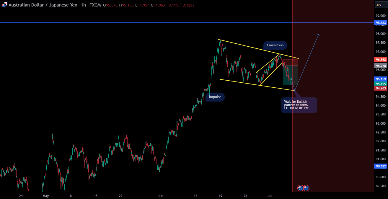 AudJpy looks cool for a bullish continuation. I am looking for long for the following reasons: 1. Clear Long Impulse 2. Two highs and lows of the corrective structure have been formed. 3. The price has come to the LTF double bottom. Wait for a LTF bullish pattern to form before entry.