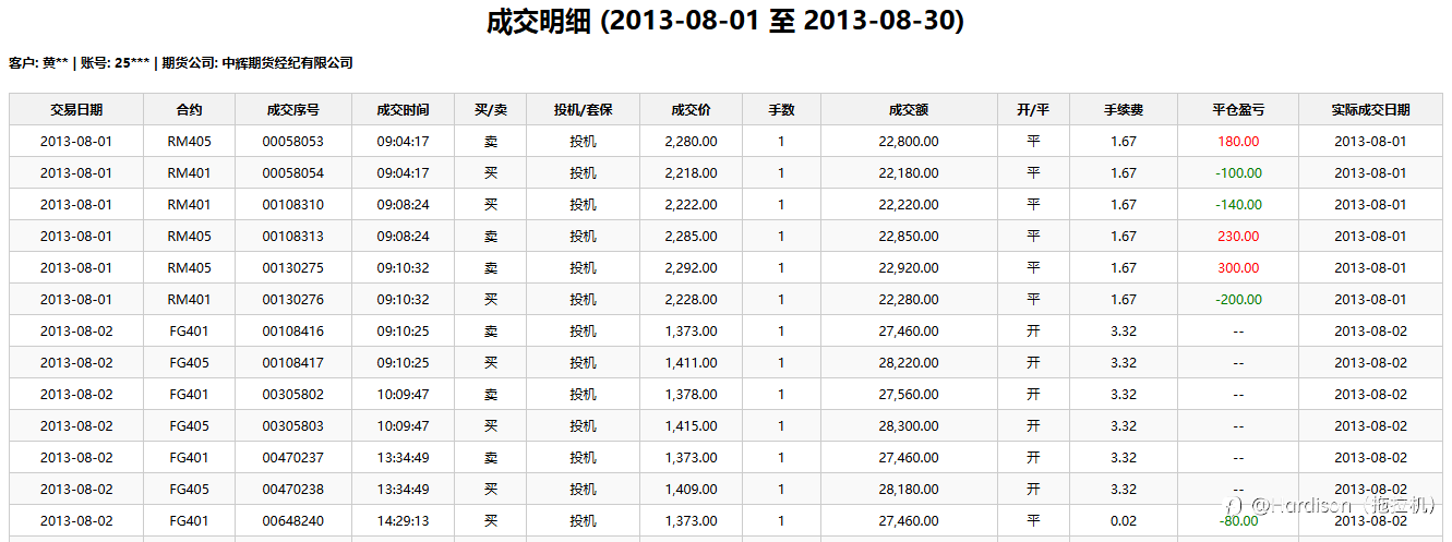 为什么,我从来不碰币圈合约? 原因就是,不支持跨期组合指令 只能纯粹赌单方向 那样的话,迟早爆仓亏光 一个显然负收益的游戏规则 我是不会参与的。 下面,将我十几年前 一个月将近5千笔期货交易单 数据发给谷歌Ai,为我生成的分析报告。 这份交易数据非常详尽,涵盖了2013年8月1日至30日的所有期货成交记录。通过对数据的深入清洗和分析,我为您生成了这份详细的期货交易分析报告。 一、 核心数据概览 (2013年8月) 基于报表底部的合计数据及逐笔明细计算: 交易品种:菜粕 (RM)、玻璃 (FG)总成交手数:4,950 手(高频/高量)总成交额:1.246 亿元平仓盈亏 (毛利):+13,740.