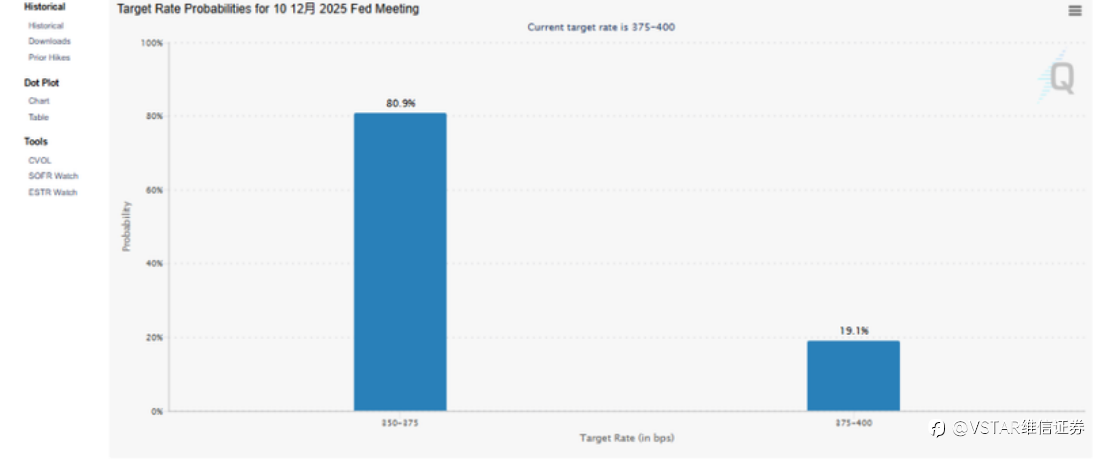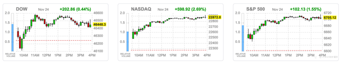 大盘回顾 科技领涨、美中缓和助力美股重回稳定区间 美股周一整体回稳,背后主要来自降息预期回升与美中关系缓和两大催化。多位联准会官员释放偏鸽言论,市场对12月降息的预期上升,使上周因估值过高而承压的科技板块出现止稳。与此同时,中美元首通话一度缓解市场对地缘政治的担忧,缓解了市场对地缘政治的担忧,开盘后指数走高。VIX 危险情绪指标大跌逾一成,显示避险需求明显退潮。主要指数在上周五跌破百日线后,今日已重新逼近50日均线。 科技股成为市场反弹的主要驱动力。Google Gemini 3.0 强劲性能表现引发关注,带动 Alphabet(GOOG) 大涨 6.3%。Meta、Netflix 在估值压力