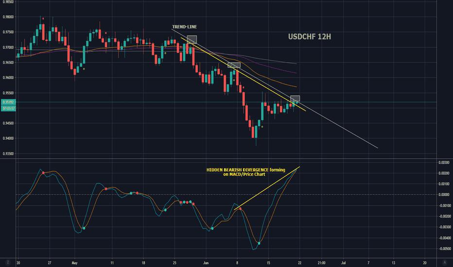 Good Evening Traders, The USDCHF is once again entering an area of strong resistance. Price has been rejected twice at the Trend-Line where two previous sell-offs occurred. Hidden Bearish Divergence is forming on the 12H MACD /Price Chart. I will be watching for a short-e
