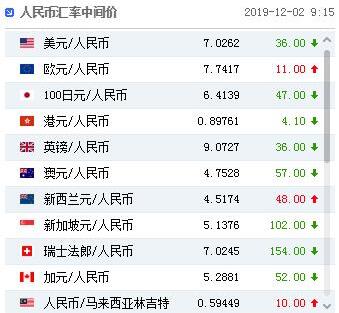 周一(12月2日),人民币兑美元中间价报7.0262,上调36点,上一交易日中间价报7.0298,在岸人民币上一交易日收报7.0261。