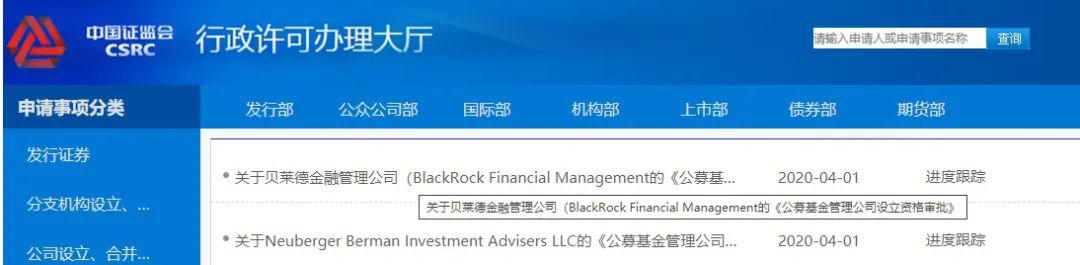 证监会网站显示,今日,贝莱德、路博迈正式递交设立公募基金公司的申请,上述申请目前处于接受材料状态。