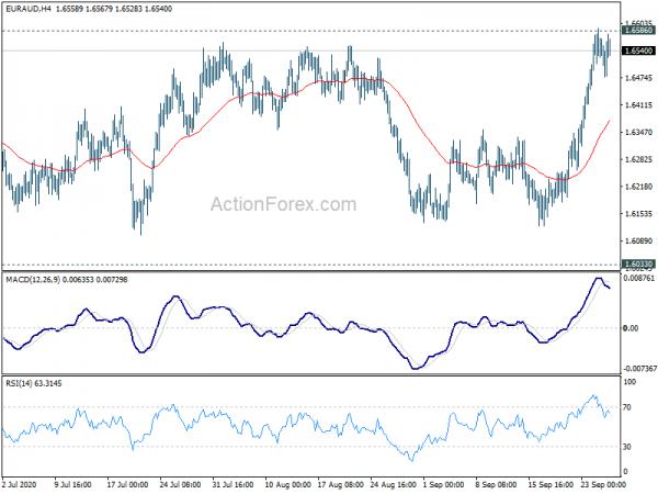 EUR/AUD rose sharply last week but failed to break through 1.6586 key resistance decisively. Initial bias remains neutral first with focus on 1.6586. Sustained break there will suggest that it’s at least in correction to the fall from 1.9799 to 1.6033. Further rise should then be seen to 38.2% retra