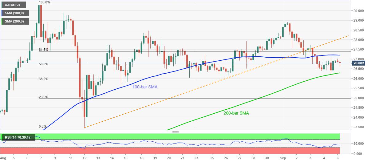 Silver prices remain on the back foot after breaking an ascending trend line from August 12.