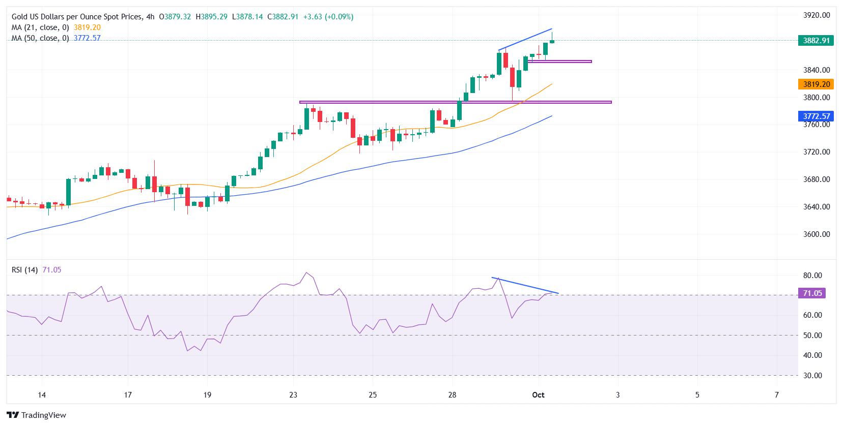 Gold extends its record-breaking rally as the US shutdown drives safe-haven flows.Fed rate-cut bets strengthen, with markets pricing a 95% chance of a 25 bps cut in October and 78% for another in December.Markets eye fresh cues from ADP Employment Change, due on Wednesday, along with S&P Global