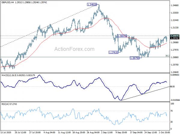GBP/USD failed to break through 1.3007 resistance and retreated notably today. Though, it’s staying in range of 1.2675/3007 and intraday bias remains neutral. On the upside, firm break of 1.3007 resistance will suggest that decline from 1.3482 is m