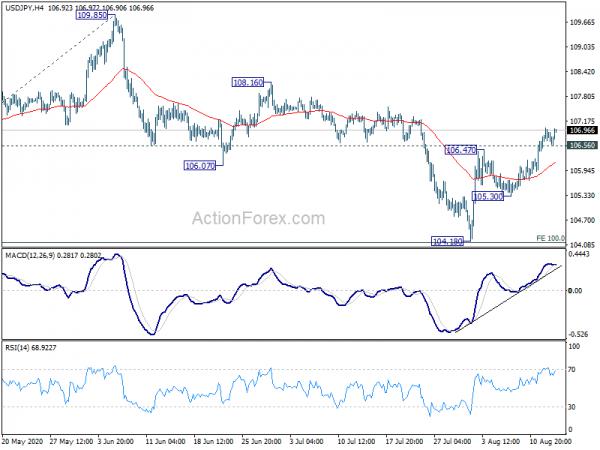 Intraday bias in USD/JPY remain son the upside for the moment and outlook is unchanged. Corrective fall from 111.71 should have completed with three waves down to 104.18, after missing 100% projection of 111.71 to 105.98 from 109.85 at 104.12. Furt