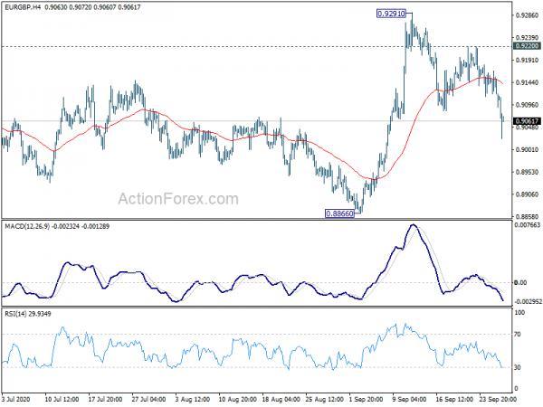 EUR/GBP drops sharply to as low as 0.9024 so far today. The break of 0.9067 support, as well as 55 day EMA, raises the chance that rebound from 0.8670 has completed. Intraday bias is turned back to the downside for 0.8866 support for confirmation.