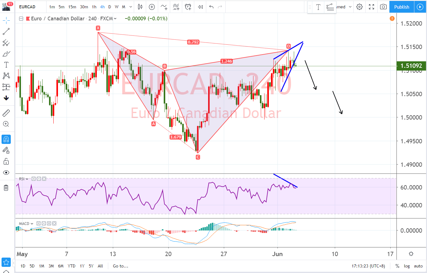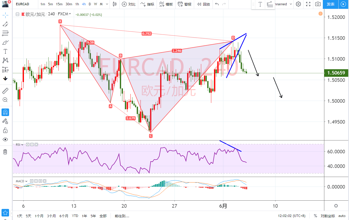 EURCAD 欧加1.511附近的空单1.506已经减仓一半,其余仓位推保护止损看第二目标。