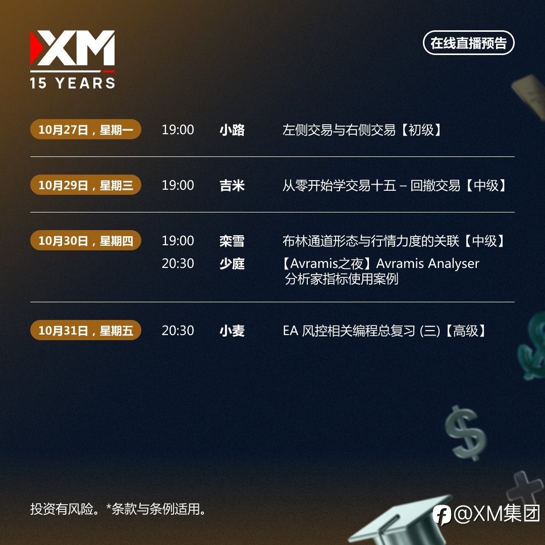 投资之路充满变数,你是否也常在“该进还是该退”之间犹豫? XM中文直播课堂带你紧跟市场节奏,每周一至周五,1小时+实战内容,提升你的交易实战力与程序化操作技能! 下周推荐【Avramis之夜】Avramis Analyser 分析家指标实战课程。掌握如何用该指标精准识别买卖信号,强化技术分析决策力。 下周课程聚焦多种交易策略与指标应用,增强你的市场判断力与策略设计能力,特别适合希望建立清晰交易系统与执行框架的你! XM下周直播课程亮点 • 左侧交易与右侧交易【初级】 :了解不同进场时机,找到适合你的交易风格。 • 从零开始学交易十五 – 回撤交易【中级】:掌握趋势回调