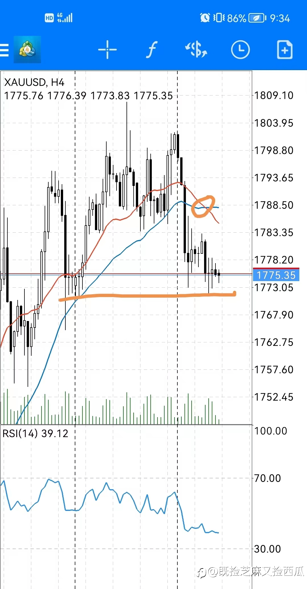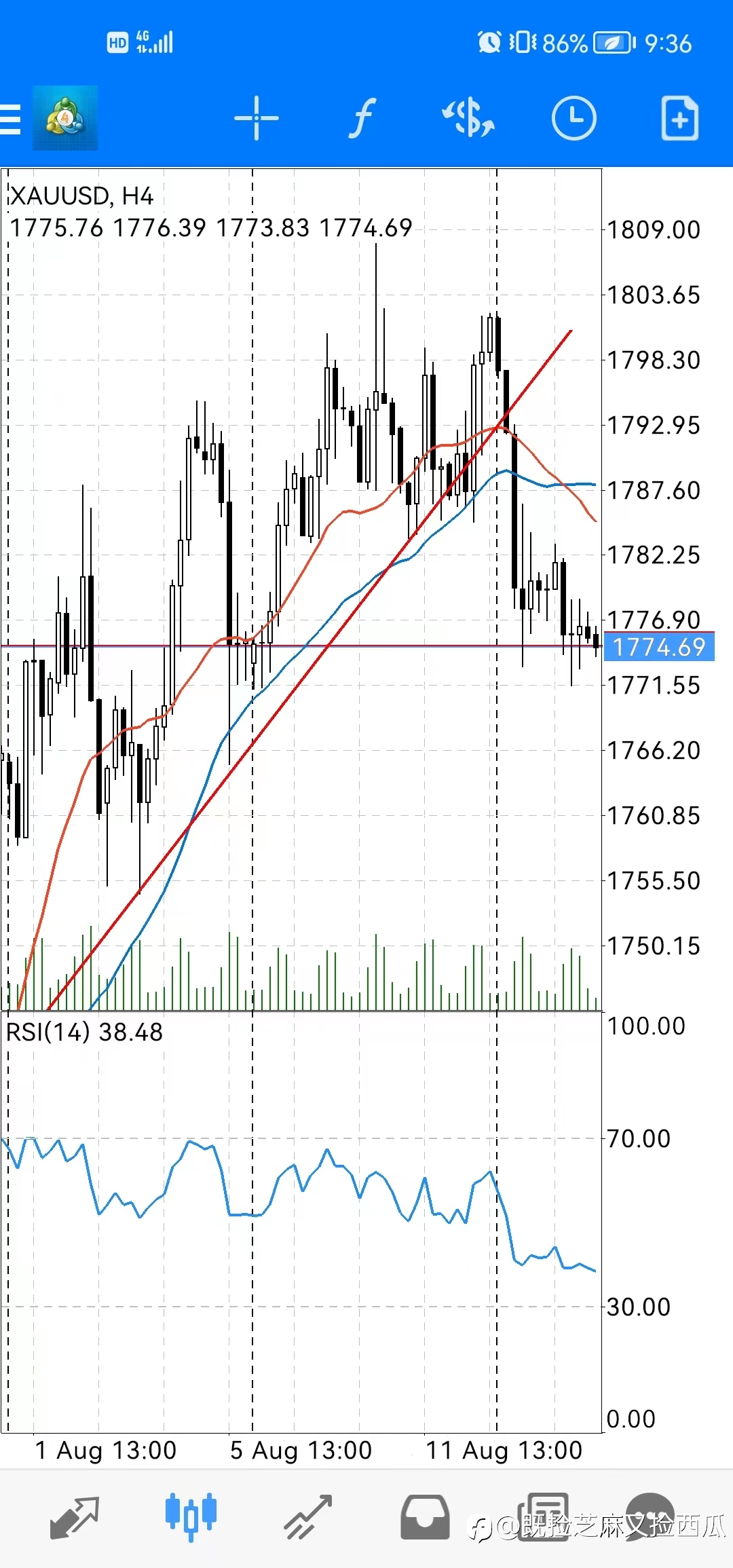 黄金下面重要支撑1771,目前看到的行情显示,趋势线破位,均线死叉,rsi位于38,行情震荡下行,今天黄金看震荡下跌,注意1771—1770的支撑,破位后可能直接去1764,今天依旧看黄金震荡下跌,入场做空位置适合于1775...
