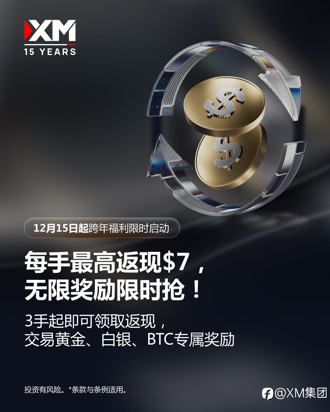 跨年专属福利:交易特定商品,享受无限返现奖励 2025年12月,XM作为全球领先的在线交易平台已成立15周年,特别推出限时福利活动回馈客户。自2025年12月15日至2026年1月15日,交易指定商品,即可获得无限返现奖励。 此次活动不仅彰显了XM对客户价值回馈的持续承诺,也为年末交易增添一份亮点与动力。交易越活跃,返现奖励越丰厚,并且收益将延续至明年,让每笔交易都发挥最大价值。 交易员仅需登录XM账户并交易指定商品,即可轻松参与活动。返现总额不设上限,为假期交易提供真正无限的回报潜力。 诚邀全球交易员参与共庆 #XM15周年 盛典,共同见证XM在成长、创新以及持续服