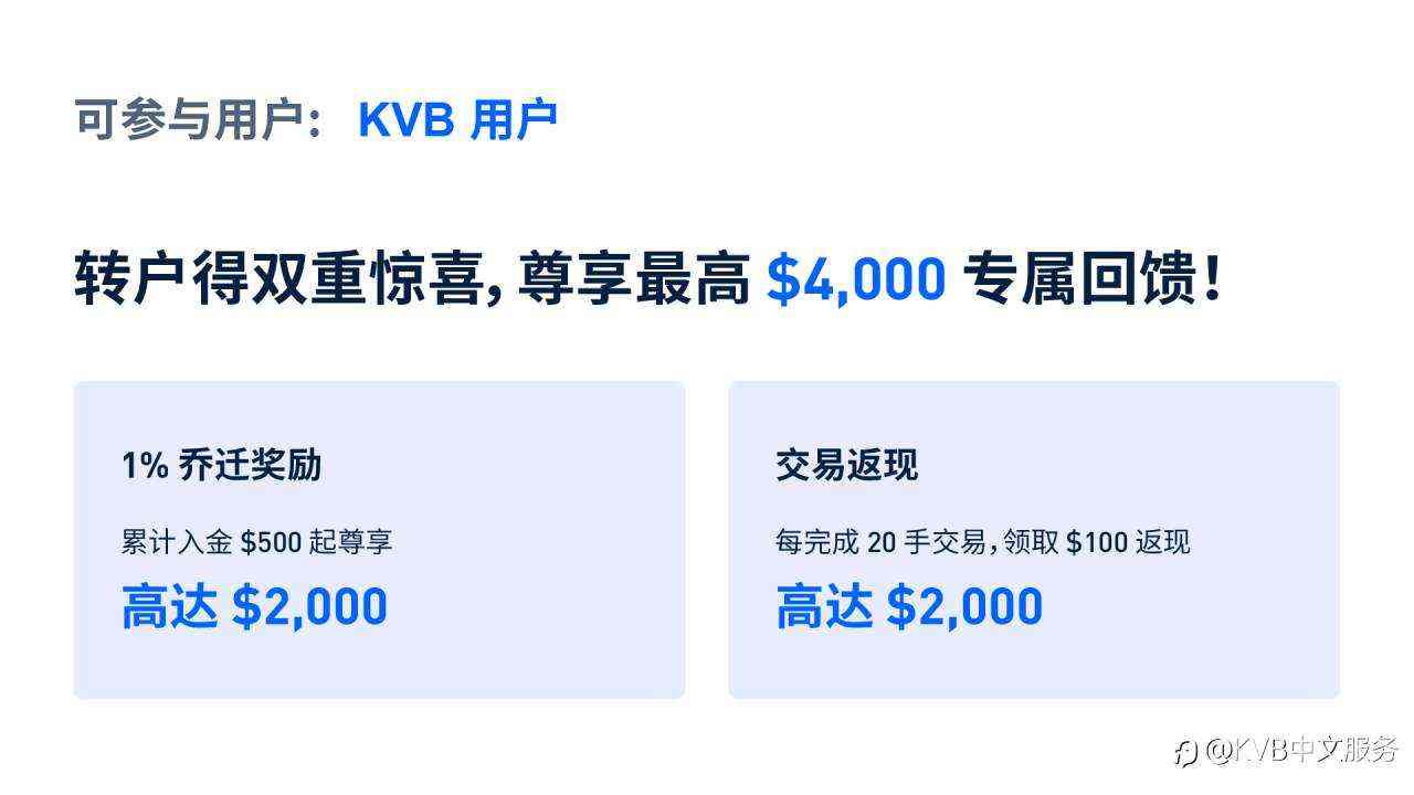 获得奖励有多简单?完成转户流程,即享专属奖励 双重奖励!一次转户,双重奖励尽收囊中!专属回馈高达 USD 4,000! 1% 乔迁奖励提交转户证明(近 6 个月原经纪商交易证明)报名后14天内,累计入金$500起验证通过后,奖励立即到账入金满 $500,立享 1% 乔迁奖励,最高可得 $2,000。交易返现可同时参与“现金返现”,每交易 20 手,领取 $100 返现入金越高,返现越多参加方法: 步骤 1 提交申请 将转户凭证发送至指定 邮箱,申请参与活动 邮箱:promotion@kvbplus.com 步骤 2完成入金 在资格确认后,14天内完成累计入金不少于 USD 500 步骤 3领取