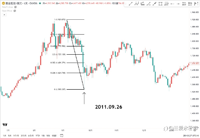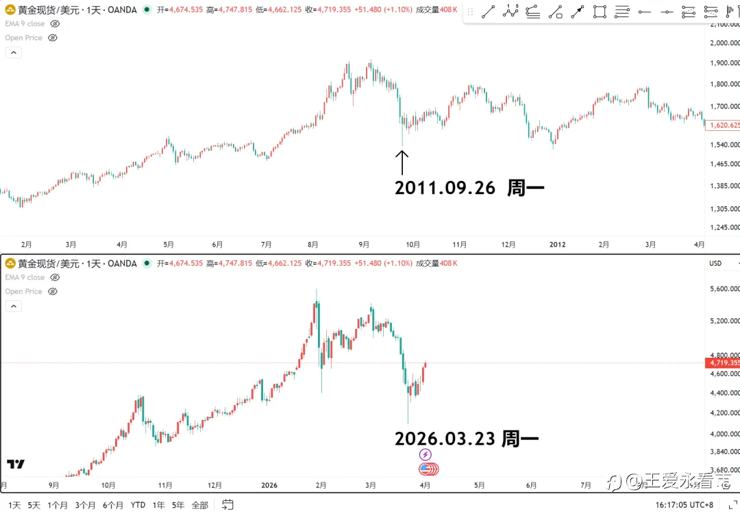 年关前后,茶余饭后谈论最多的就是黄金白银的牛市,跟当年跑步入场买房的情景是不是很像? 如果你对这个品种不是很了解,因为脑子一热进场了,那现在估计是被套状态,最大的跌幅就是从美伊战争之后,3.02号开盘开始下跌,所以,以后再听到谁说:战争一响,黄金万两,你就知道咋回事了。 3.03号预警过黄金的次高点【黄金次高点已现?】,如果你买了纸黄金或者ETF还没有出,还处于被套状态,那最近反弹之后还是有机会出来的。 来对比一下2011年9月份和现在的黄金走势。 1:前面是一波轰轰咧咧的多头趋势,并且最后加速上涨。 2:第一波洗盘后,拉起来再次大洗盘。 3:二次洗盘的低点都在周一的欧盘时间。 4:跌幅达到2