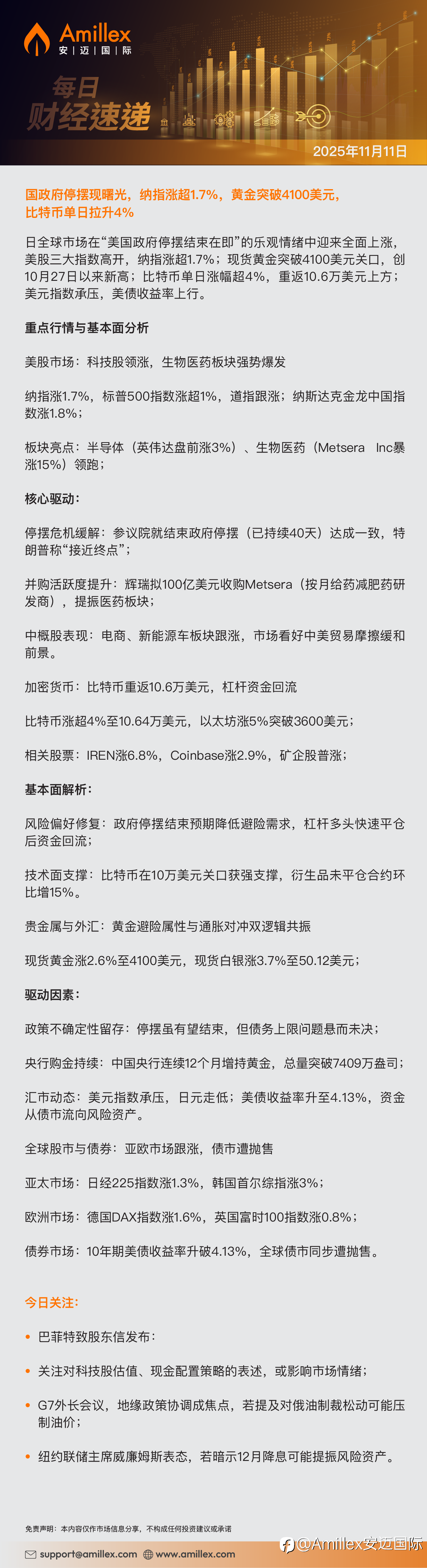 1. 主要指数 · 标普 500:+1.54%,报 6 832.43 点 · 道琼斯:+0.81%,报 47 368.63 点 · 纳指:+2.27%,报 23 527.17 点 · 纳斯达克 100:+2.20%,报 25 611.74 点 · 罗素 2000:+0.94%,报 2 455.65 点 · VIX:-7.76%,报 17.60(恐慌情绪明显回落) 2. 行业 ETF(已披露) · 半导体 ETF:+3.07%(领涨) · 全球科技股指数 ETF / 科技行业 ETF:≥ +2.56% · 网络股指数 ETF:+1.72% · 能源业 ETF:+0.90% · 全球航空业 ETF