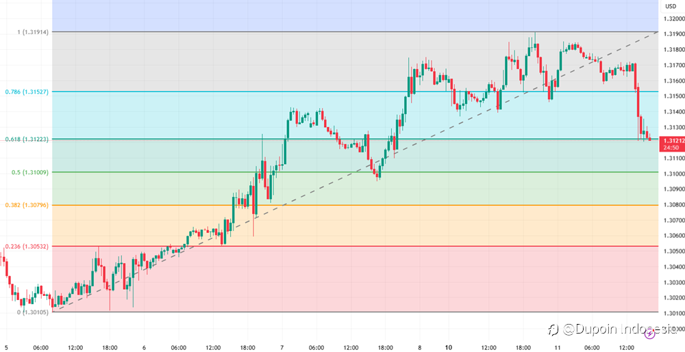 Trend : Bearish| Timeframe 30m Poundsterling Melemah, Kehilangan Momentum Bullishnya Pasangan GBP/USD hari ini bergerak melemah ke area 1.3120, menguji level Fibonacci 61.8% (1.3123) dari tren naik sebelumnya yang dimulai dari 1.3010 hingga 1.3191. Area ini menjadi batas kritis bagi sterling, karena