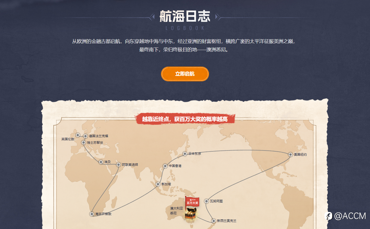 2026年,ACCM新春启航——环球寻宝热门活动,重磅回归!航程解锁玩法,奖池丰厚。 活动时间:2026年2月1日–2026年2月28日 活动规则: 交易手数将记录于您的航海日志。交易10手起,即可前进至相应港口开启幸运抽奖,每一次抽奖都是独立机会,均有可能直接解锁重磅大奖,奖励100%覆盖。成功航行至终点的探险家,必将赢取100万积分终极大奖!即刻启航,每一次交易,都是驶向财富与荣耀的航程!快来试试手气吧! 奖池包含: 报名方式:客户登录用户后台选择环球宝藏之旅热门活动报名即可 【立即参与】左手点财富,右手点团圆,交易不掉线,年味正当时!我们不见不散! ACCM 祝您新春愉快,交易顺利!