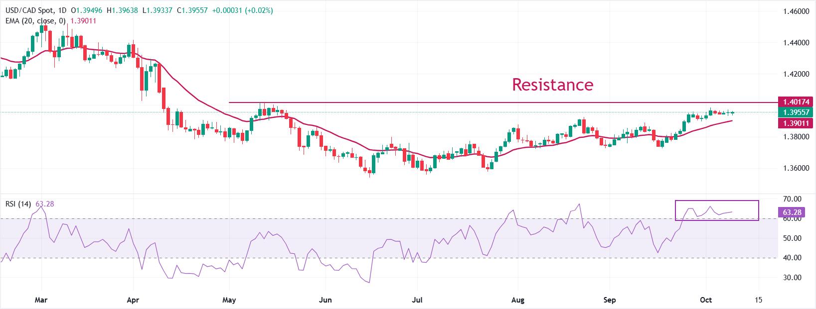 USD/CAD menunjukkan kekuatan di dekat 1,3980 menjelang pidato The Fed Powell.Risalah FOMC menunjukkan tanda-tanda lebih banyak pemotongan suku bunga di sisa tahun ini.Para investor memprakirakan tingkat pengangguran Kanada meningkat lebih lanjut menjadi 7,2% pada bulan September.Pasangan mata uang U