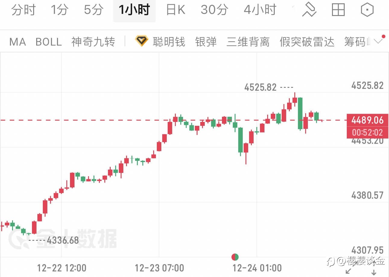 #XAU/USD# 昨日黄金整体走出强势冲高走势,开盘于4487,盘中一路上行刷新高点至4525,最终昨日收盘于4484,整体呈现出冲高后小幅回落的态势,多头在日内一度占据绝对主导,价格在高位区间反复震荡,展现出前期强势的延续性。 今日上午,现货黄金走势迎来明显转变,价格自4525的高点快速下探,最低触及4471,截至14:07,报价为4489,仅微涨0.10%,多头动能显著衰竭。消息面来看,欧美等地股市提前收市,金银油交易也随之提前结束,市场流动性收缩加剧了价格波动;同时,美国至12月20日当周初请失业金人数数据尚未公布,市场对美国就业市场的