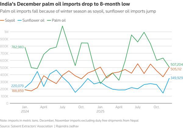 Ipotnews - Impor minyak sawit India, pembeli minyak nabati terbesar di dunia, turun ke level terendah dalam delapan bulan pada Desember lalu. Kilang-kilangdi negara tersebut lebih banyak membeli kedelai dan minyak bunga matahari ,di tengah melemahnya permintaan musiman selama bulan-bulan musim dingi