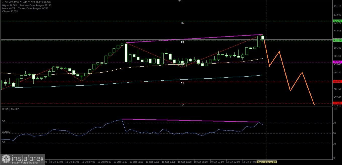 Dengan munculnya Bearish Divergent pada RSI Perak memiliki potensi terkoreksi melemah, Senin 13 Oktober 2025.