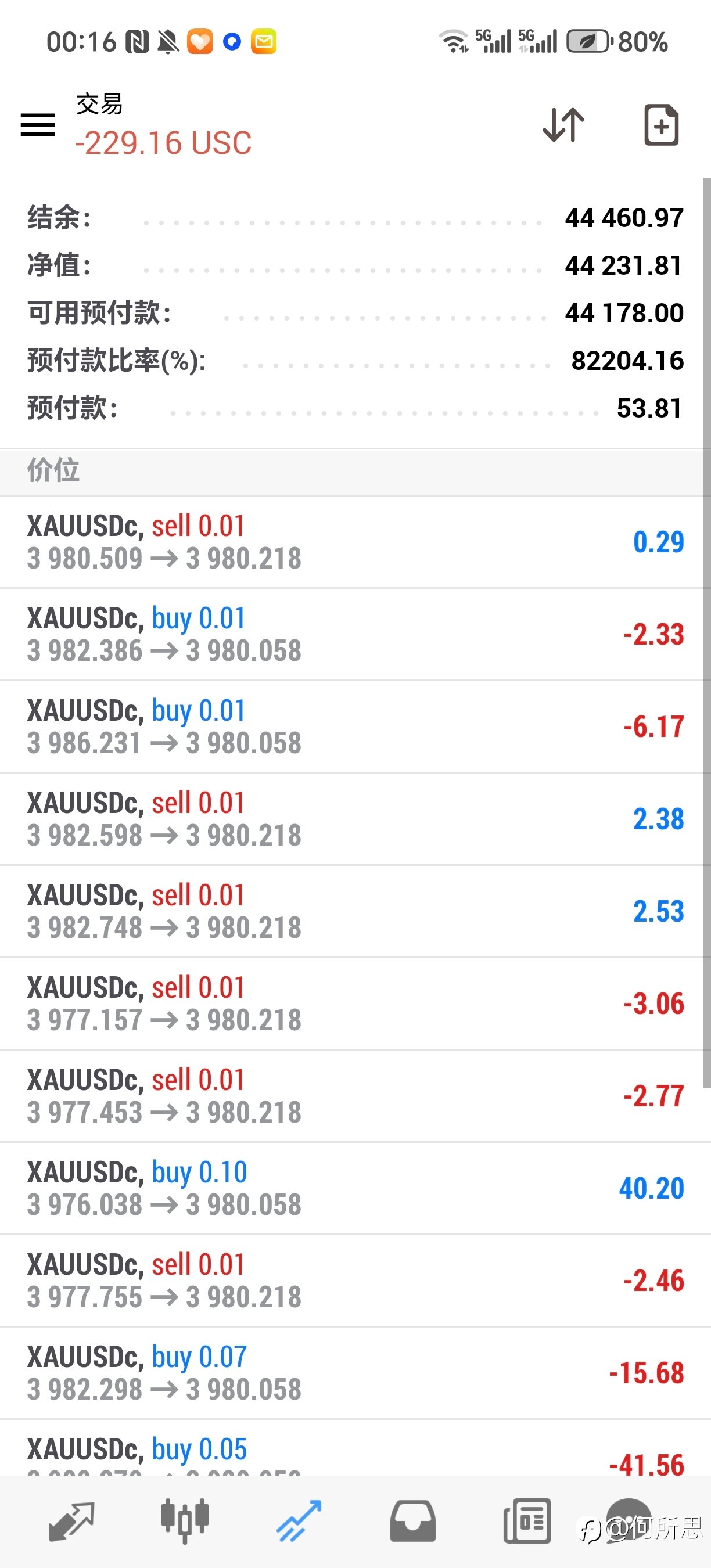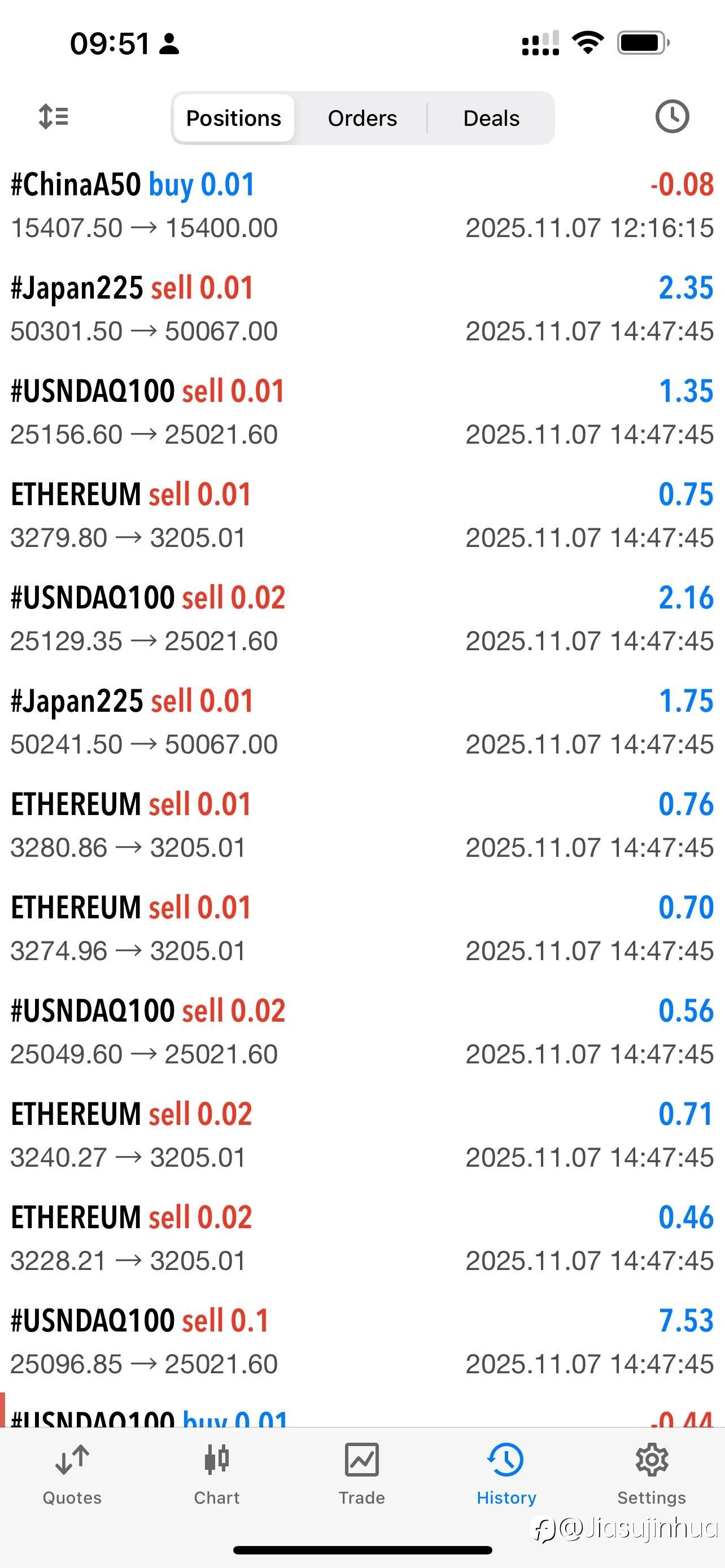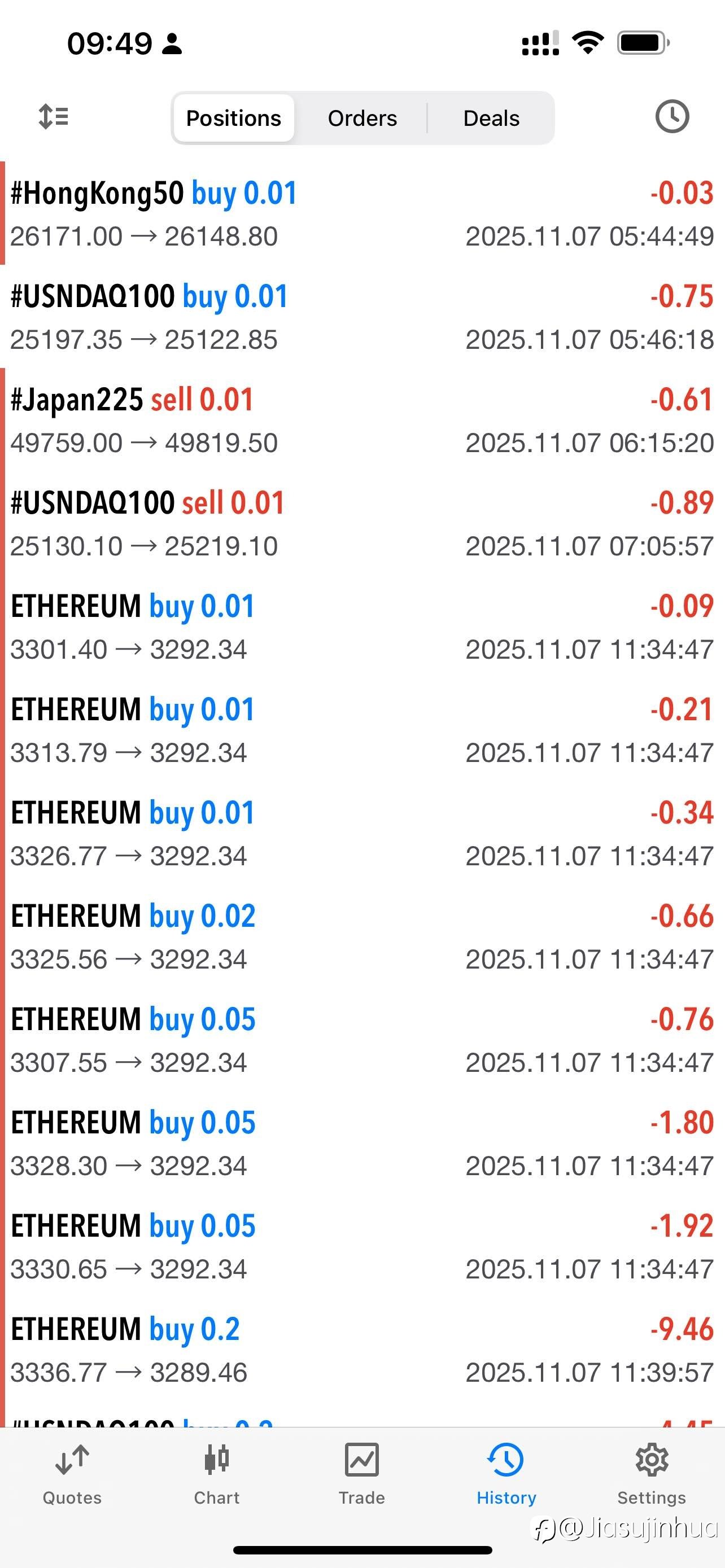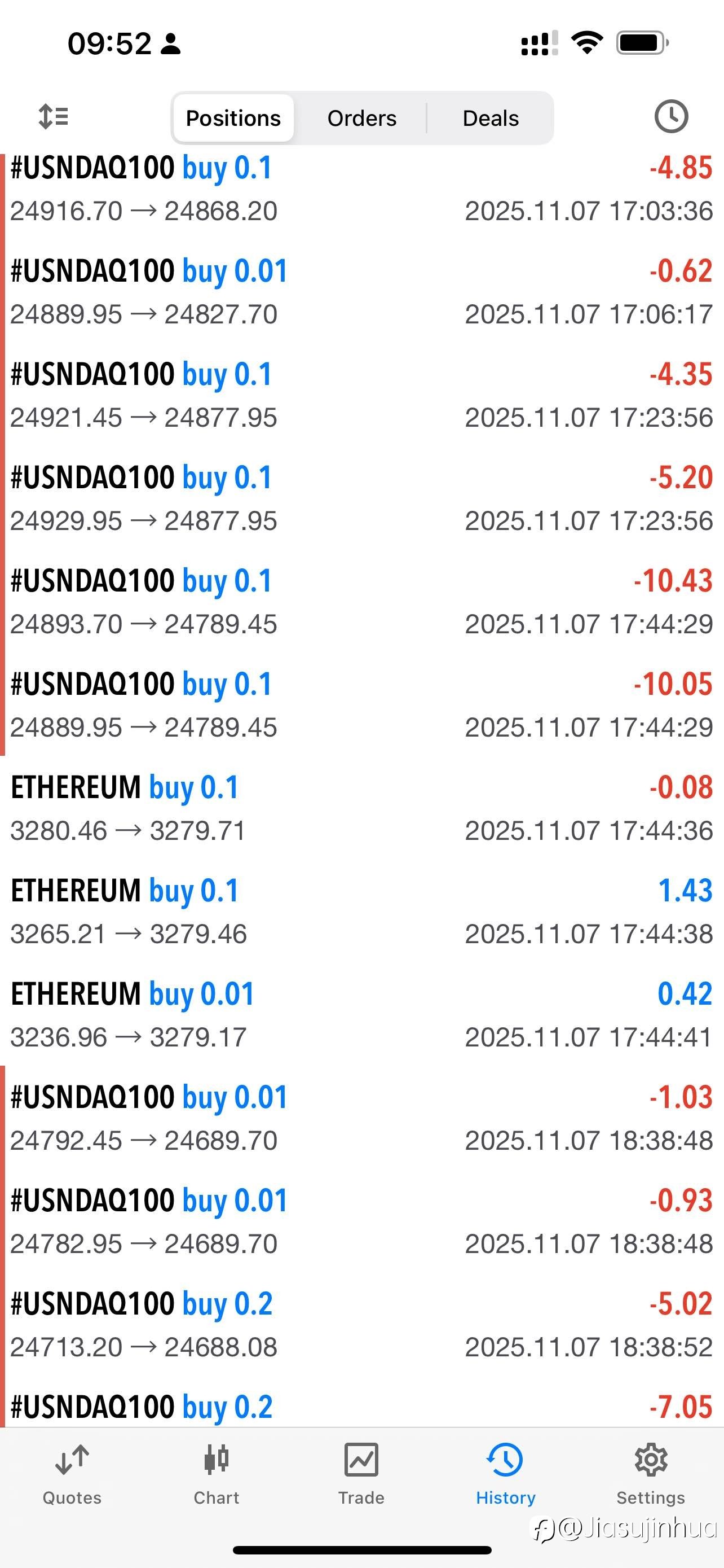 对投资缺乏深度的思考,情绪化操作差点再次爆仓。 还是熟悉的开始:先是小仓位建仓,买了几手纳斯达克(NASDAQ)的0.01手多单,盈利后便逐步加仓。但上午九点多,纳斯达克突然转跌,所有仓位全部扫损平仓。 之后观察走势,判断市场可能继续下跌,于是尝试性建了2手0.01手的纳斯达克和日经空单,结果在震荡中再次扫损平仓。这时我才开始反思,是不是方向从一开始就做错了。 后续的操作整体上是开始往多头方向转换:先后在纳斯达克下跌、出现企稳迹象时买入多单,买入后虽有短暂震荡上行,但最终还是一路下跌。如此反复尝试几次后,尤其看到日线回踩均线、纳斯达克呈现出持续性下跌态势时,我主观认为反弹随时可能启动——总觉得