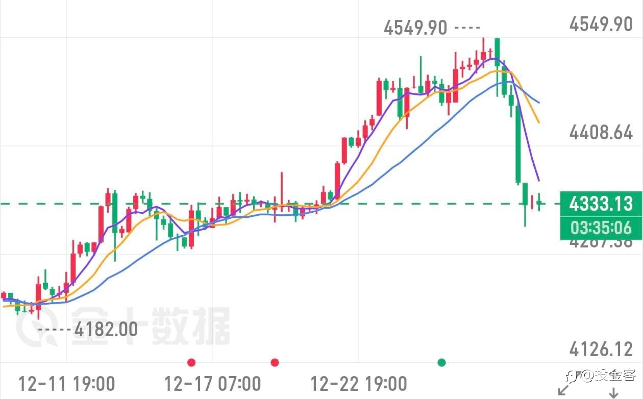 投资就像囤金,真正的赢家从不是追着行情跑的人,而是守住自己的节奏、等对关键点位的人。耐心不是被动等待,而是在不确定性中,依然相信中长期的逻辑,不慌不忙布局属于自己的机会。 昨日黄金市场迎来剧烈调整,价格从4500美元上方直线下探至4303美元附近,单日跌幅超200点,上周积累的涨幅被大幅回吐,不少追高投资者遭遇深度套牢。年线定调前多空博弈势必加剧,无需纠结方向预判,聚焦核心点位即可规避操作风险。 此次大幅回调的核心逻辑清晰可辨:一方面,俄乌冲突局势出现缓和迹象,前期支撑金价的避险情绪逐步退潮,溢价空间持续收缩;另一方面,市场对美联储2026年降息路径的分歧持续扩大,叠加年末机构结
