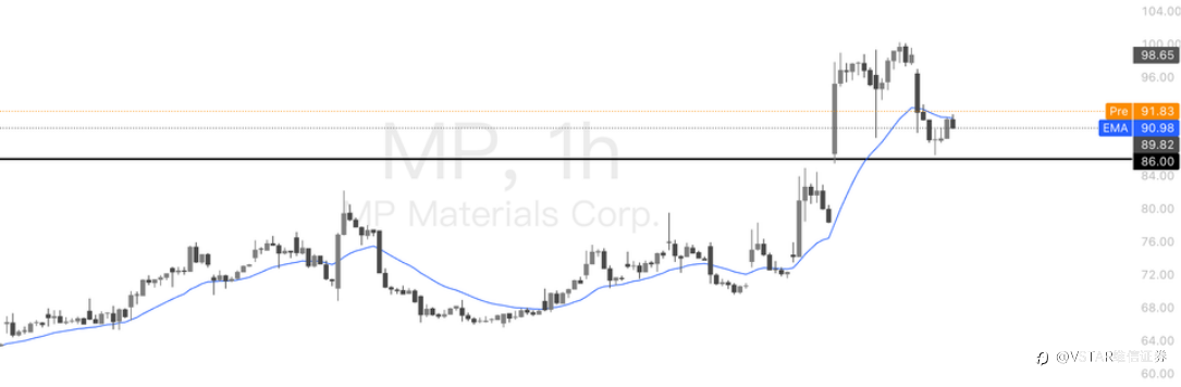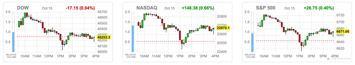 大盘回顾 AMD 创历史新高,贸易与财报成关键影响因素 昨日美股开盘时受金融类股亮眼财报的带动高开高走。美国银行(BAC)第三季度营收同比增长 11% 至 281 亿美元,每股收益 1.06 美元,优于市场预期;摩根士丹利(MS)每股收益 2.80 美元,同样远超市场预期,推动股价上涨。 但随后美中贸易紧张局势升温,导致盘中震荡。美国财政部长表示,若中国放宽稀土出口管制,美国可能延长对中商品高关税的暂停期限;而美国贸易代表则称中国对稀土的出口限制构成 “经济胁迫”。午后公布的褐皮书显示,美国整体经济活动变化不大,劳动力市场持续降温,市场对降息的预期升温,主要指数收复跌幅,标普 500 指数接近