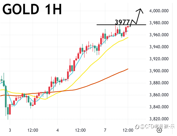 10/07 午盘策略:黄金/美日 美国政府持续停摆 日本选举结果令人意外 金价创历史新高 【基本面分析】 周一(6日)美国无重要经济数据公布。美国国会未能通过新一轮预算案,政府持续停摆,若时间拉长,或迫使美联储月底采取风险管理式降息。 美国政府停摆、美联储降息预期,帮助金价延续涨势,突破3900关口后仍不断刷新历史新高。 日本高市早苗胜出,其政策主张弱日元,打击加息预期,日元暴跌,推升美元。 【技术分析】 黄金一小时图,均线呈现多头排列,多方动能强劲,若多方攻势延续,再创波段新高,可伺机追多。 【操作建议】 Buy Stop3977 ,止损3970以下,目标3988-3989 以上纯属各人观点