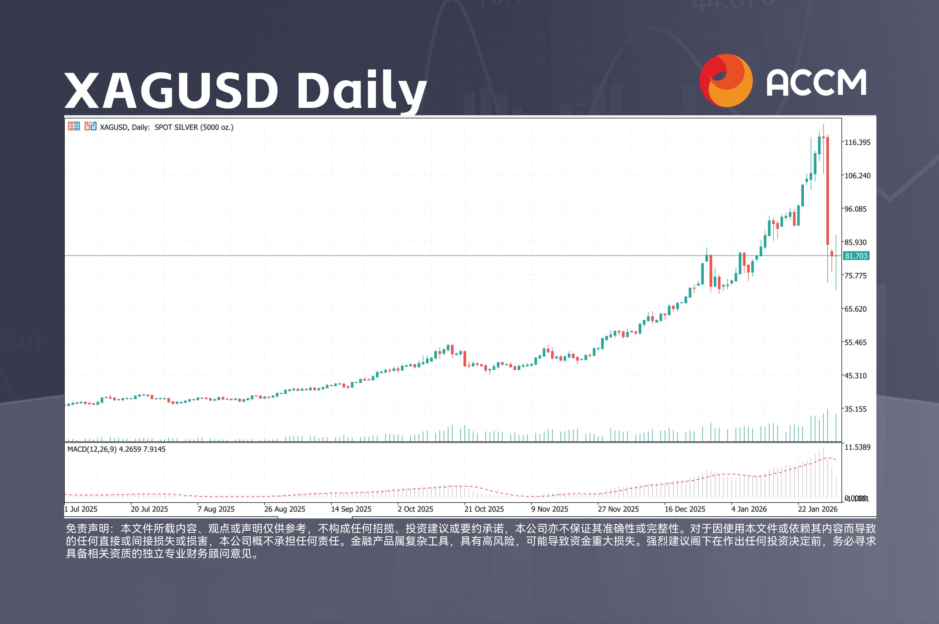 周一,美国股市高开,在经历上周五大宗商品价格暴跌引发的市场动荡后,于新一周伊始趋于稳定。本周将密集公布一系列关键经济数据与企业财报,市场情绪仍保持谨慎。 贵金属价格大幅回落。上周五,白银录得自 1980 年 3 月以来最为惨烈的一次单日跌幅。此前,芝加哥商品交易所集团(CME Group)宣布,自周一收盘起上调白银合约的保证金要求,对市场构成明显冲击。 白银在上周触及 每盎司 121.64 美元的历史高位后,迄今已累计回撤 超过 30%。黄金同样大幅下挫,上周后段跌幅接近 10%,价格明显跌破数日前刚刚触及的 5,000 美元以上历史高位。 XAGUSD Daily 周一,现货黄金价格进一步下