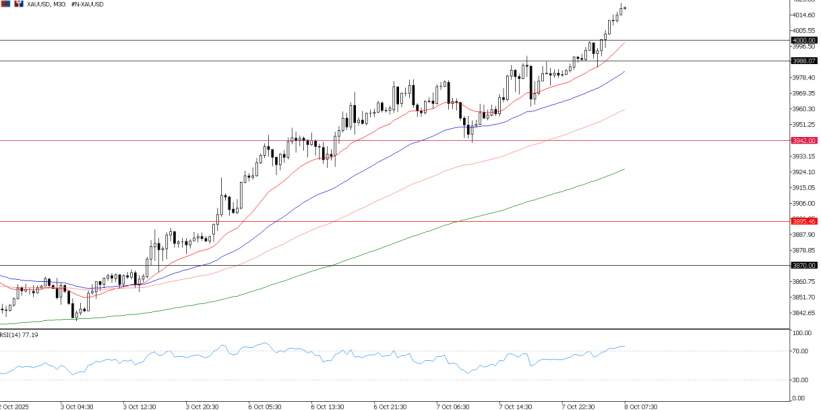 黄金突破4000美元纪录高位; 风险货币承压 黄金首次突破4000美元 黄金飙升至历史新高,盘中一度突破每盎司4000美元关口,受避险需求强劲推动。当前全球不确定性高企,投资者纷纷涌入黄金市场寻求避风港,使得看涨情绪持续高涨。 本轮涨势主要受到市场预期更宽松的央行政策与低利率环境支撑,同时,美国政府停摆、欧洲政治紧张及日本领导层更替等事件,也进一步强化了避险买盘。 总体而言,市场情绪依然明显偏向黄金,多头买盘及结构性避险需求共同推动金价上行。 XAU/USD,M30图表 从技术面来看,黄金突破4000美元后,该价位已成为关键支撑位。短暂回调后价格再度上扬,显示出强劲的多头动能。 若涨势延续,下