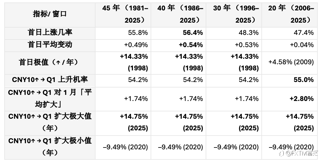 有投资港股的朋友们都会听说过,围绕香港恒生指数的两个常见「季节性说法」—— 开门红(农历新年后首个交易日上升)、一月效应 ——我们用 20/30/40/45 年四个窗口,拆解一下究竟这个交易是否真的可行?另一个参考是农历年后一段时间的升势是否能反映到第一季(Q1)整体的升势呢? 我们参考CNY 后10个交易日恒指上升, 之后Q1相对1月是否扩大作为参考,与前面常提到的开门红及一月效应作了一些统计及比较,发现了把仓位压在复市第一天,胜率仅略高于掷硬币,反而观察农历年后10个交易天的走势有更高的参考价值。 1) 开门红:存在,但很弱 长周期测试(40–45年)首日上涨的概率约 55%–5