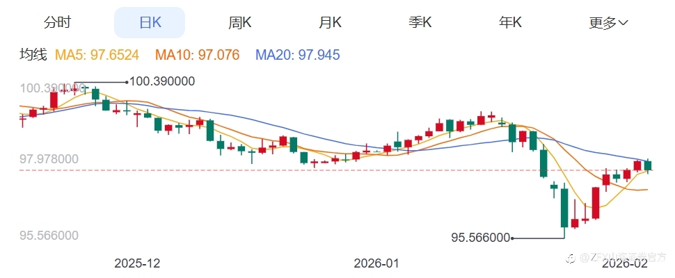 现货黄金在经历了前一日暴跌3.9%的“黑暗星期四”后,于上周五(2月6日)上演绝地反击,单日狂飙近4%,现货价格一度逼近每盎司4955美元,周线顽强收涨。周一(2月9日)亚市早盘,现货黄金延续涨势,一度上涨1.7%至5046.15美元/盎司。美元疲软与地缘担忧的“共振效应”,引发了此次的金价反弹。 一、美元疲软与地缘迷雾 美元指数在上周五下跌0.2%,结束了连续多日的强势。尽管整周仍录得上涨,但此时的回落,对于以美元计价的黄金而言,如同卸下了一副沉重的枷锁,使其对持有欧元、日元等其他货币的投资者而言变得“更便宜”,从而刺激了实物买盘和投资需求。这种“跷跷板”效应在情绪敏感时期总是被放大。 伊朗