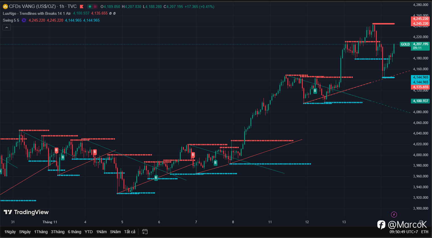 Dưới đây là cập nhật cho XAU/USD (vàng so với USD) vào ngày 14/11/2025, cùng với phân tích kỹ thuật khung 1h và khung 4h