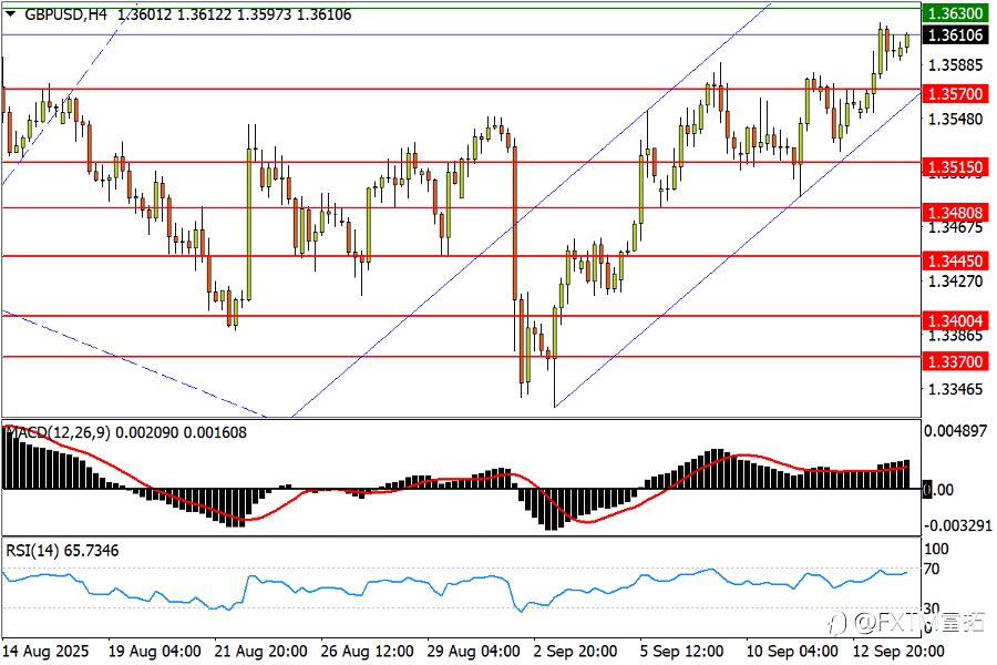 NO.1 英镑/美元 (GBP/USD) –冲破两月新高,有望勾勒头肩底 日线图看,随着本周FOMC会议临近,降息预期继续发酵。美元疲软作用下,令镑/美刷新两个多月高点,同时打响冲击1.3590一带前高密集区的攻坚战。如果汇价得以站稳6月中旬高点1.3630,市场7月来的宽幅震荡即将完成复合头肩底形态的打造,并重塑冲击年内高点的势头。途中阻力将依次遭遇22年高位密集区1.3680,以及2022年高点1.3750。指标方面,MACD紧贴零轴上方金叉后续涨;RSI缓步升向超买线,均凸显英镑眼下温和强势。 4小时图看,镑/美本月形成全新的震荡升势,目前在击穿密集高位后稍作整固。回撤风险来