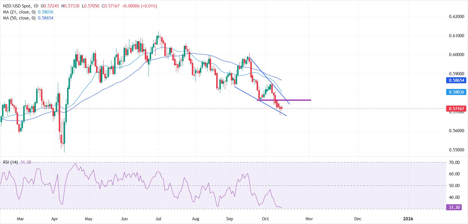 NZD/USD melemah untuk hari ketujuh berturut-turut, melanjutkan tren turunnya di tengah tekanan jual yang berkelanjutan.Pemotongan suku bunga agresif RBNZ dan prospek dovish terus membebani Kiwi di tengah fundamental domestik yang lemah.Pengaturan teknis menunjukkan pola falling wedge yang terbentuk,