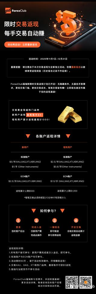 ForexClub福瑞斯限时交易返现计划盛大开启! ——每笔交易自动返现,黄金每手最高返$5! ForexClub福瑞斯限时交易返现计划已开启!无隐藏条件,无最低手数要求,更低交易门槛,更低交易成本,笔笔交易皆有赚!立即报名激活专属于您的返现通道! 活动时间:2025年11月1日-12月31日 活动详情: 活动核心亮点 无门槛参与,全用户覆盖!零隐藏条款,透明规则!无论您是新用户还是资深交易者,只需简单操作即可加入返现计划,无复杂限制:标准账户与ECN账户均可参与! 新用户:完成首次入金,立享黄金、白银等热门品种每手$5返现! 现有用户:交易累计返现最高可达$100