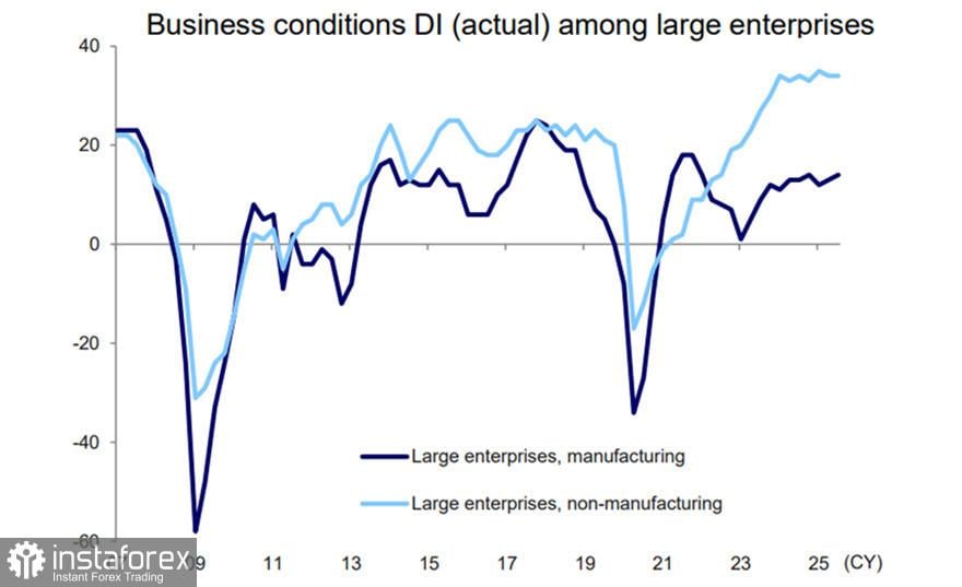 Hasil survei Tankan Bank of Japan (BoJ) untuk bulan September, yang dirilis pada 1 Oktober, menunjukkan peningkatan dalam indeks kondisi bisnis (DI) sebesar 1 poin dibandingkan dengan bulan Juni untuk produsen besar, mencapai +14. Indeks untuk perusahaan non-manufaktur besar tetap pada tingkat yang