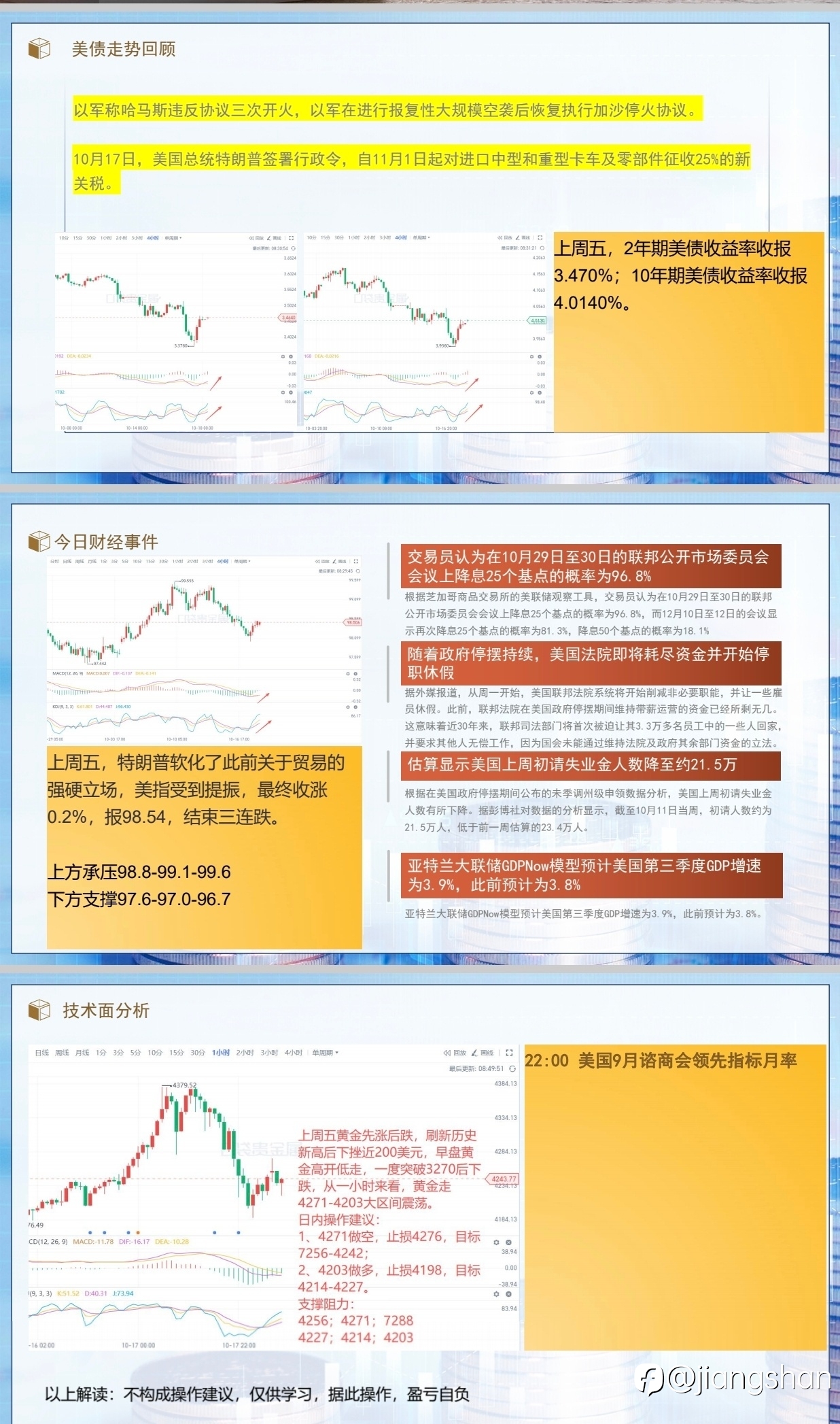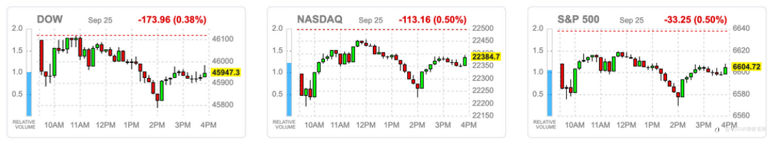 大盘回顾 强劲数据压制降息预期,美股连跌三日 隔夜美股承压下行,三大指数连续第三日下跌,创一个月最长连跌纪录,几乎抹去美联储9月会议后的涨幅。强于预期的宏观数据成为压制风险资产的主要因素:美国二季度GDP增速上修至3.8%,初请失业金人数降至21.8万,耐久财订单月增率高达+2.9%,全面优于市场预估。这一系列数据凸显经济韧性,却令市场对美联储未来降息路径产生疑虑,10月降息预期明显降温。 利率市场方面,美债收益率全线攀升,2年期收益率上行4.5个基点,美元连续第二日走强至三周高点,美元兑日元逼近150关口。风险资产情绪承压下,数字货币大幅下挫,比特币跌破11万美元、日内下跌3.62%,以太坊