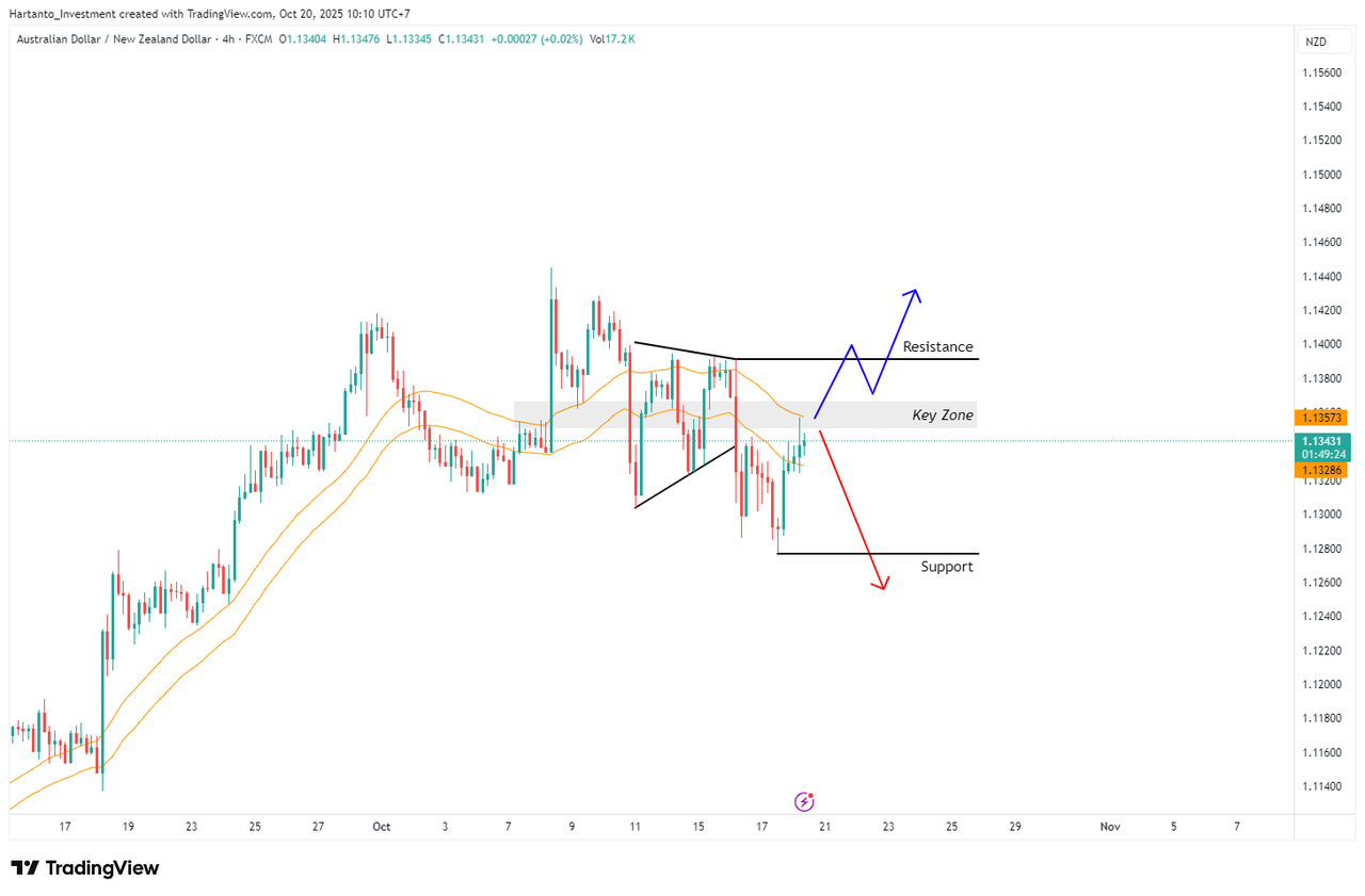 Pergerakan AUD/NZD pada time frame H4 saat ini terlihat berada di sekitar area key zone 1.13670–1.13500 yang bertepatan dengan resistance dinamis WMA 41. Area ini menjadi titik penting bagi seller untuk mengambil alih kendali harga setelah sebelumnya harga gagal menembus area tersebut secara m