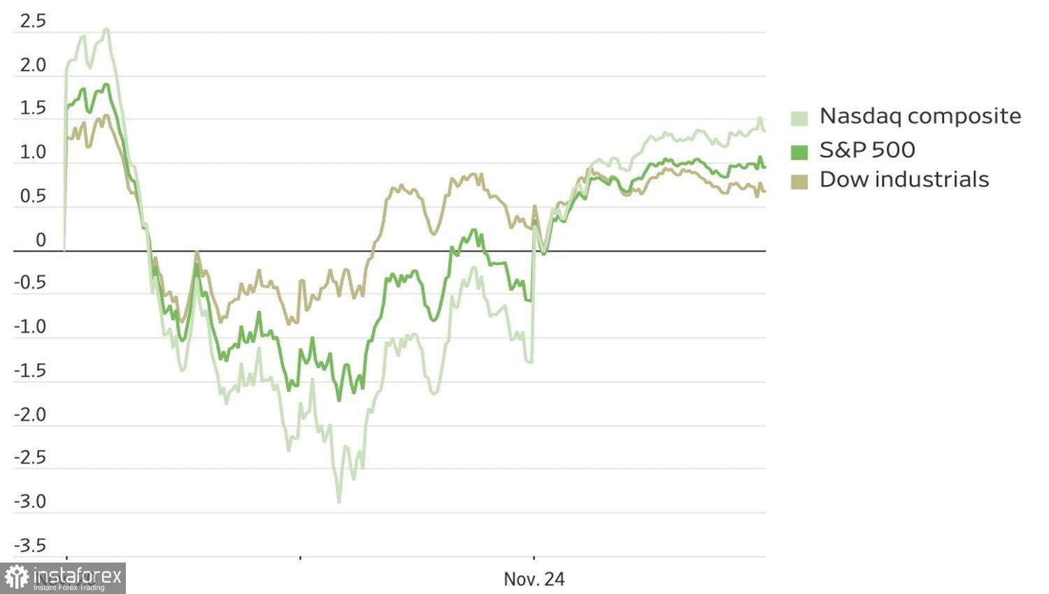 S&P 500 mencatat rally harian terbaiknya dalam enam minggu terakhir, sementara Nasdaq 100 mengalami kinerja terkuat sejak Mei, seiring dengan meningkatnya ekspektasi pelonggaran kebijakan moneter oleh Fed pada bulan Desember menjadi 81%. Pasar berjangka berfluktuasi antara ekstrem, bergantian an