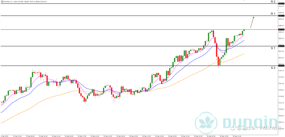 Analisa Teknikal Trend : Bullish Timeframe : H1 Emas naik selama perdagangan sesi Amerika Utara pada hari Selasa namun tetap di bawah level tertinggi yang dicapai pada perdagangan sesi Asia $3.871. Di tengah ketakutan akan penutupan pemerintah AS, data lapangan pekerjaan menguatkan ekspektasi pemang