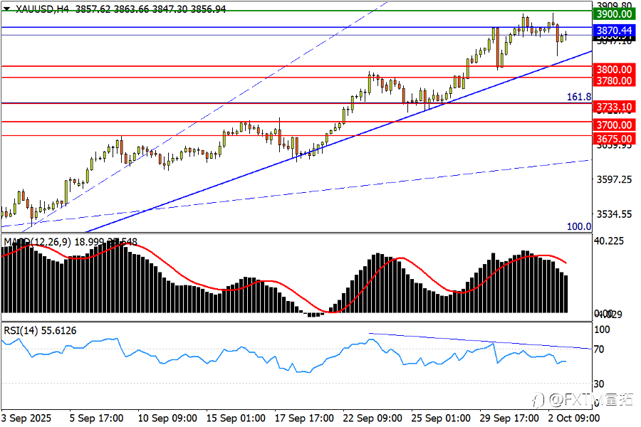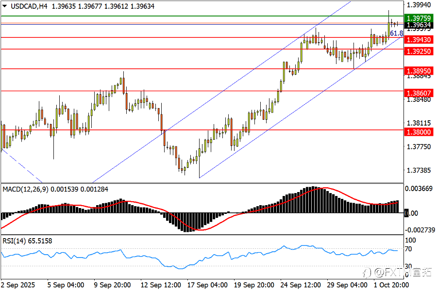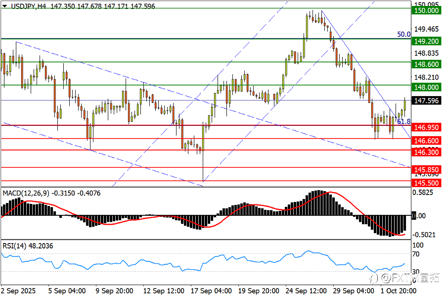NO.1 美元/日元 (USD/JPY) –失业率意外疲软,146.60上方阶段起底 日线图看,Z府停摆令市场进入美国数据盲区,美/日隔夜中断之前四连阴。而亚市早盘最新的日本失业数据意外来到阶段高位,巩固企稳势头。走势看,汇价有望再次固守在2021年起一根长期升势支撑上方,并延续3个月来宽幅震荡模式。点位看,6月23日剧震高点148.00为上方初步阻力,随后5月高点148.60,以及去年9月-今年1月涨势的149.20多半抛压渐重。指标方面,MACD死叉后快线接近下穿零轴;RSI跌回弱势区,多方先前优势丧失殆尽。 4小时图看,美/日隔夜起底后有打破新近弱势的迹象,多头有意在上述涨势