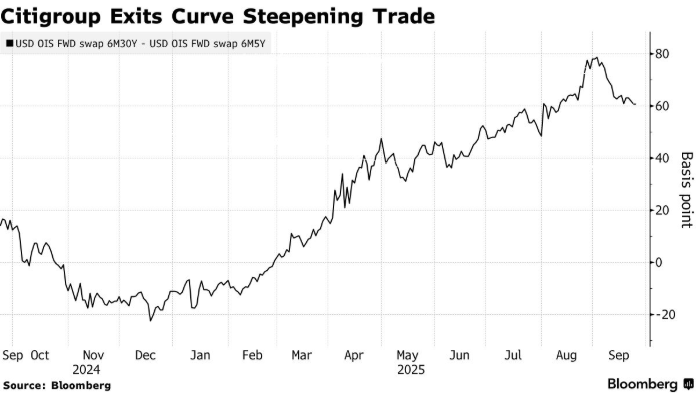 风暴过去了?华尔街巨头平仓关键交易,只因上周那一场11:1的投票……花旗集团的策略师们退出了一个押注长期美国国债将在对美联储的攻击加剧时,表现逊于短期国债的交易建议,他们表示,上周一项近乎一致的政策决定,“在边际上”减少了对央行独立性的担忧。 包括Dirk Willer和Adam Pickett在内的策略师,建议客户在该交易触及移动止损后,对押注30年期利率远期合约将落后于5年期合约的头寸进行获利了结。 他们在5月份于两者差值为40个基点的水平上发起了该交易,并在8月份于72个基点的水平上增持了该头寸,最终在60个基点的水平上退出。 花旗四个月前的最初建议,是基于对美国总统特朗普标志性的税收和