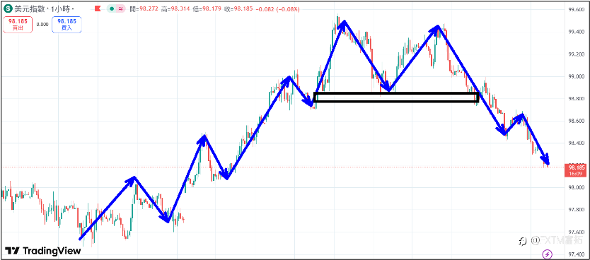 美国股市三大指数16日走势同步拉回修正,其中道琼工业指数收盘下跌301.07点,跌幅0.65%,标普S&P500指数收盘下跌41.99点,跌幅0.63%,而纳斯达克则是收盘下跌107.54点,跌幅0.47%,本周市场焦点黄金价格屡创新高,接连突破4100美元、4200美元,以及昨日凌晨突破4300美元,提醒市场投资人,金价短线多方相当强势,但同时注意过热涨多急速下跌行情,需多家谨慎注意短线剧烈波动。 另外,技术分析面切入1小时级别观察美元指数冲高后出现M型空方头部,目前美元K棒跌破颈线,呈现空方排列,有望持续向下修正,建议投资人偏空看法为主。 技术分析(黄金XAUUSD) 技术分析面切